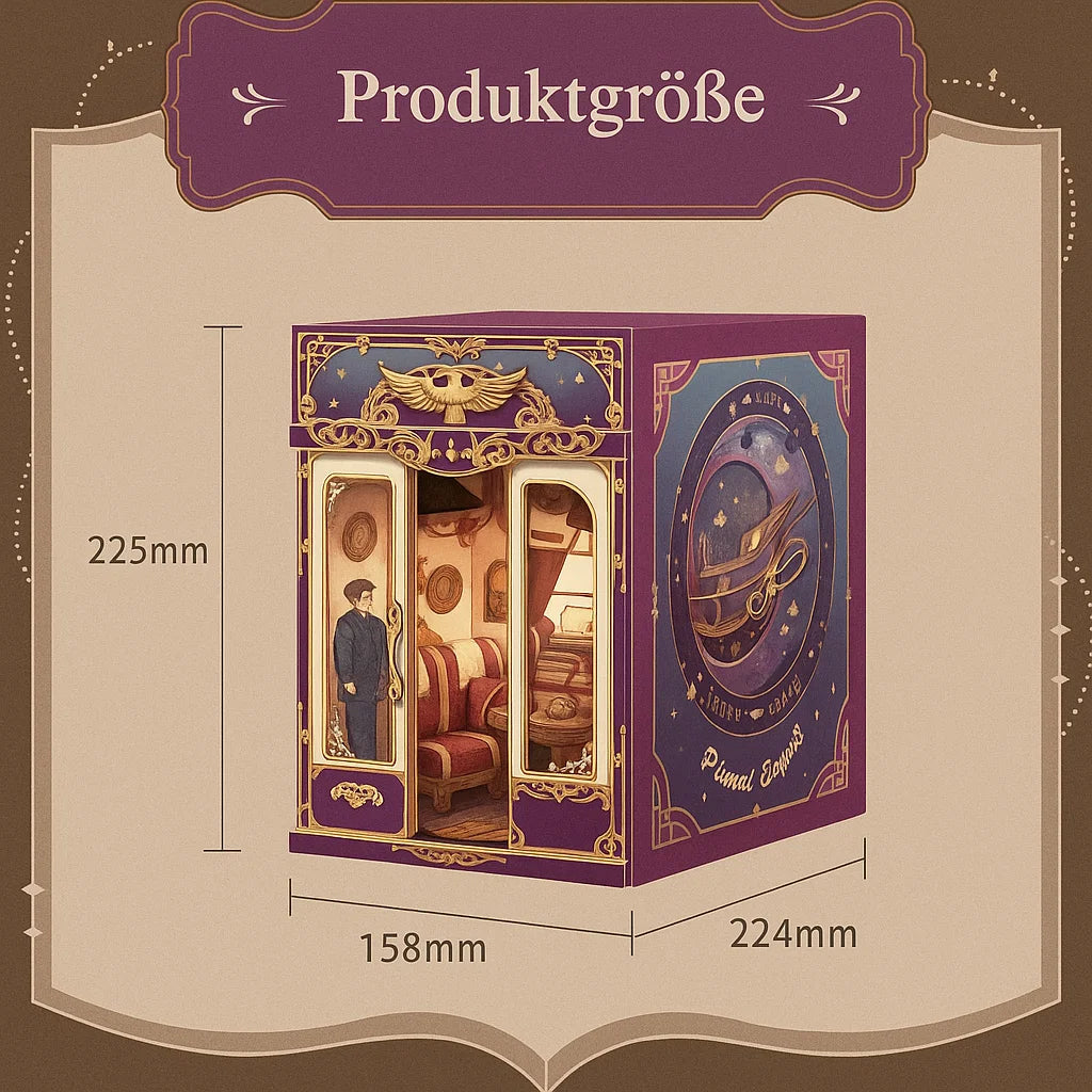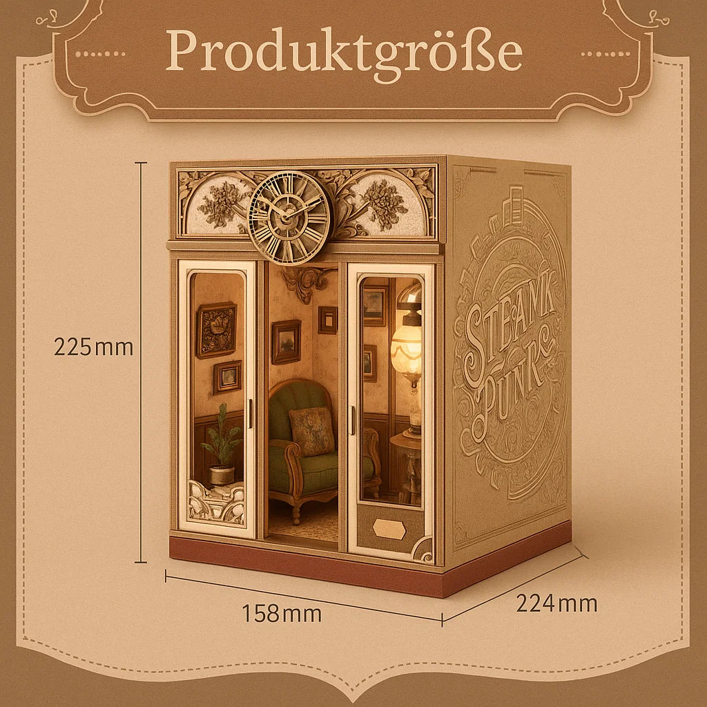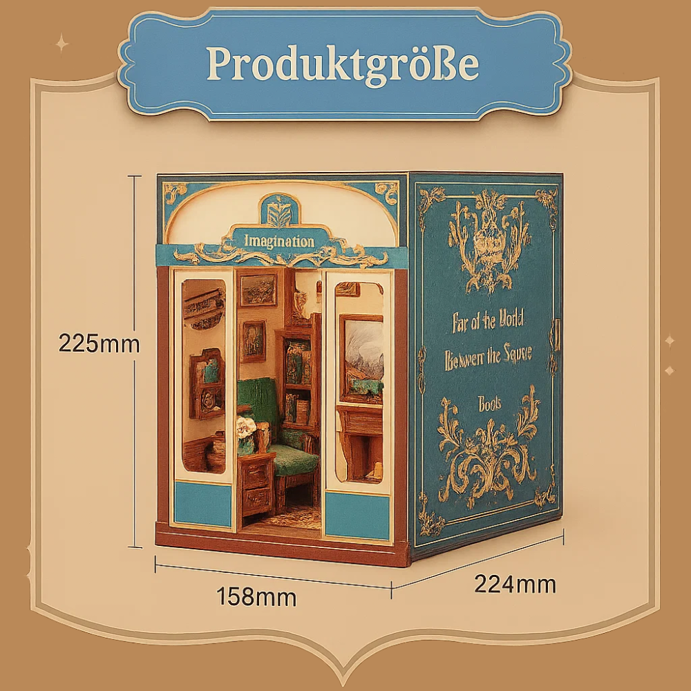 Die Fertigstellungszeit kann je nach Herangehensweise variieren! Unsere Book Nooks sind auf Effizienz ausgelegt, da kein Färben oder Bemalen nötig ist – die Sperrholzstücke sind bereits vorgefärbt.